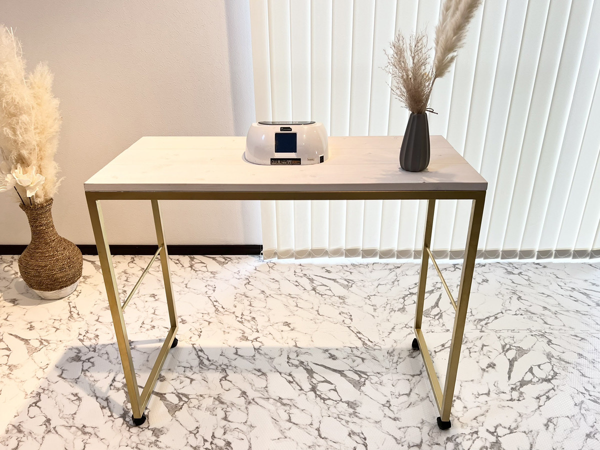 脚部はアイアン製でイエローゴールド塗装仕上。天板はウッドを採用し、表面をマットホワイトでラフ塗装仕上を施しています。